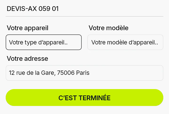 Remplissez notre formulaire de devis pour décrire votre problème. Si vous êtes éligible à la réparation à domicile, vous recevrez un mail pour choisir le créneau qui vous convient.